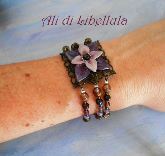 Un altro lavoro su richiesta, in questo caso un bracciale che avrebbe dovuto accordarsi con una collana , sempre realizzata da me, con un fiore sul viola su base color bronzo. Ho usato una filigrana quadrata scurita con acrilici, su cui ho posto un fiore in pasta polimerica, il cui centro è una perla di granato. La fascia del bracciale è costituita da tre fili di cristalli, perline e pietre dure (granati, ametiste) e termina con una chiusura a barra.
