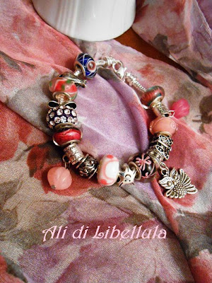 Bracciali, colorati e tintinnanti....ne ho creati quattro, per il momento, secondo uno schema molto di moda e reso celebre da marchi famosi. Questi sono meno impegnativi, in ogni senso, costituiti da un laccio in silver con chiusura a vite, abbellito da perle a foro largo in vetro e metallo, intervallate da rondelle in strass, spaziatori in metallo con animaletti e simboli, charms, cristalli.